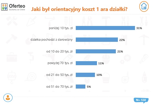 Ankietowani przez serwis Oferteo.pl zostali również zapytani o cenę, jaką zapłacili za działkę budowlaną. Z udzielonych odpowiedzi wynika, że 31% z nich udawało się zmieścić w kwocie 10 tys. zł za ar, 21% płaciło między 10 a 20 tys. zł, a 11% – nawet powyżej 70 tys. zł.