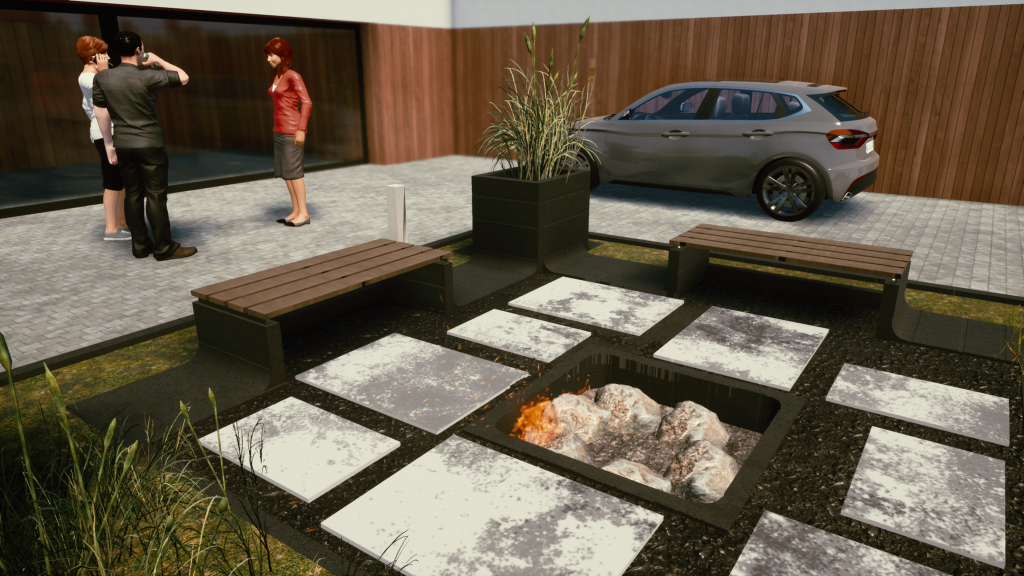 Meble powstałe dzięki nieoczywistym sposobom wykorzystania prefabrykatów betonowych można łączyć w spójne, wieloelementowe kompozycje. Dla przykładu po obydwu stronach betonowej sofy stworzonej z elementów Polbruk Neo można umieścić wykonane z tego samego prefabrykatu kwietniki i posadzić w nich ozdobną zieleń, tak potrzebną do prawdziwego relaksu. Aby zachować modernistyczny charakter aranżacji, a zarazem ukoić zmysły, do stworzonego już wcześniej „kompletu wypoczynkowego” można dołączyć oczko wodne, mini fontannę lub kaskadę ze zbiornikiem, do którego będzie spływała woda. Pozwoli to wprowadzić do otoczenia szum płynącej wody, który działa uspokajająco i skłania do relaksu. Obudowę zbiornika wodnego można bez trudu wykonać na przykład z prefabrykatów Polbruk Albero. Murek ten łączy klasyczny kamienny wygląd z nowoczesnym charakterem. Aby to zrobić, w przestrzeni pomiędzy ścianami wykonanymi z Albero należy umieścić zbiornik z pompą wodną, którą będzie tłoczyła wodę ku górze (musi być podłączona oczywiście do źródła zasilania). Innym ciekawym i możliwym do uzyskania efektem, jest woda tryskająca z kamieni. W tej wersji nad zbiornikiem mini fontanny umiejscawia się ruszt i po jego osadzeniu układa na nim kamienie, na przykład otoczaki. Interesującym rozwiązaniem aranżacyjnym jest również kaskada, do której idealnie nadaje się już wcześniej wspomniany Neo. Sposób wykonania i osadzenia niecki jest identyczny, z tym wyjątkiem, że jedna ze ścian musi być wyższa. To właśnie w niej ukrywa się rurę prowadzącą od pompy w niecce do wylewki zlokalizowanej w górnej części ściany. Spływająca po ścianie woda stworzy kaskadę. Miłośnicy grilla lub fani ognisk z pomocą prefabrykatów betonowych mogą wymurować także palenisko. Osadza się je nieco niżej powierzchni, tak aby górna krawędź zrównywała się z płaszczyzną nawierzchni. Takie miejsce pod ognisko można zbudować z kilku obrzeży Tigela ułożonych na boku i tworzących kwadrat. W przypadku budowy grilla konieczne jest natomiast wzniesienie wyższej, wyrastającej ponad ziemię konstrukcji, najlepiej z bloczków Neo lub Albero z pustą przestrzenią w środku (miejsce na opał) oraz rusztem umiejscowionym w górnej części.